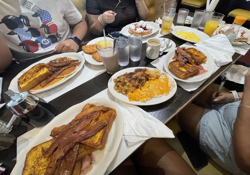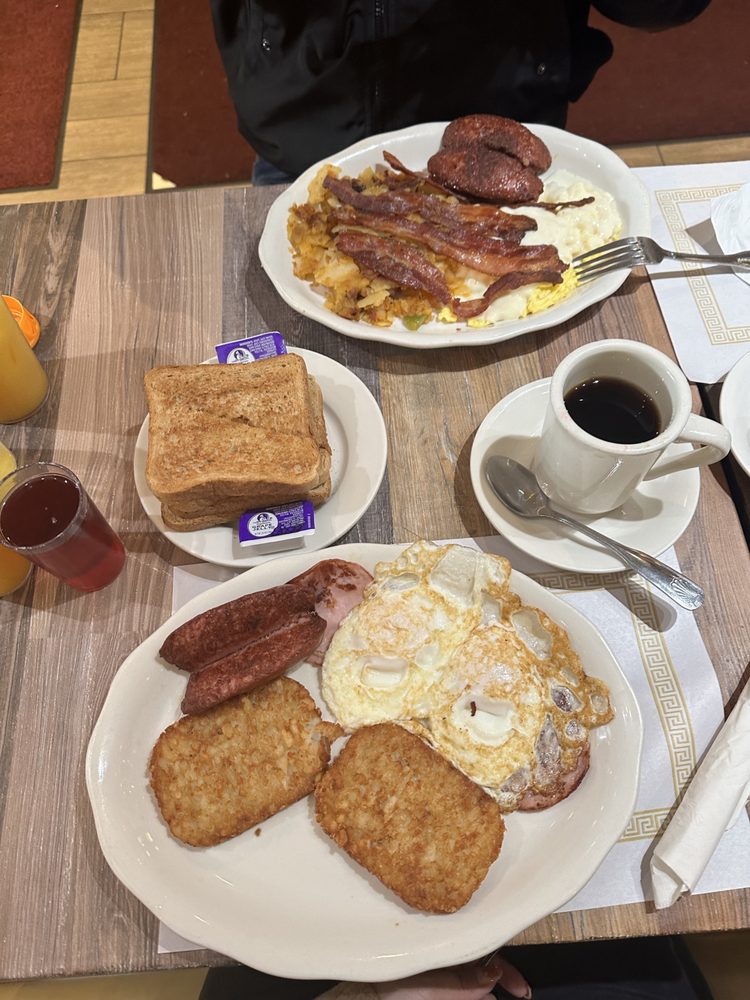 2 pancakes, 1 piece of French toast, 2 eggs, bacon, ham and sausage with your choice of side.