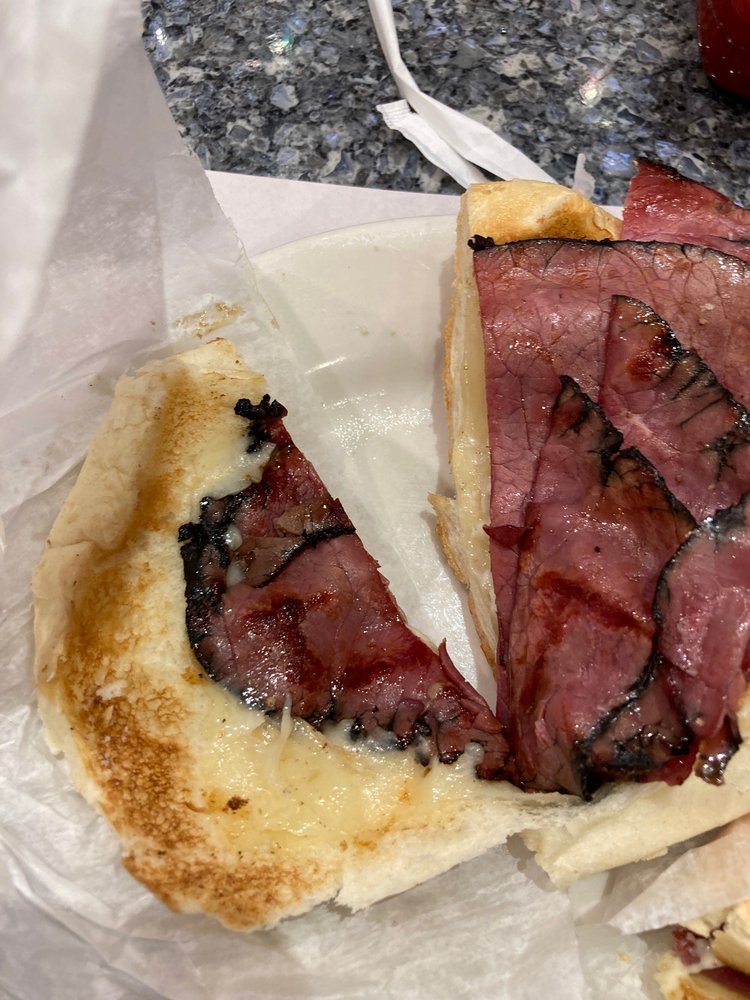 Home-style challah bread. French toast with bacon, ham, sausage and 2 eggs.